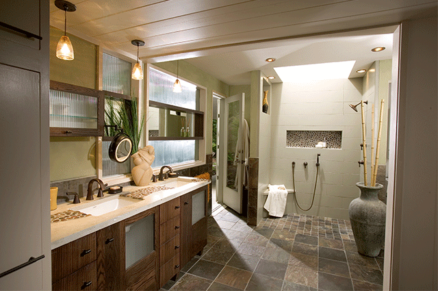 Showers are becoming more popular than tubs. “Homeowners are looking to embellish the ‘shower experience’ rather than the tub experience,” says Neil Kelly Design Consultant Kathleen Donohue. An increasingly popular feature is the curb-less shower.